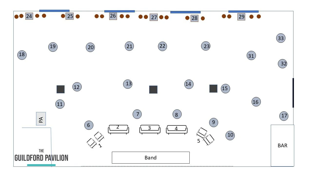 Seating is either in front row settees/armchairs, central round tables, or rear high chairs/tables. Seats will be reserved for you when you book. If you’re a Guildford Jazz member, please let us know if you have a seating preference in on the booking form.