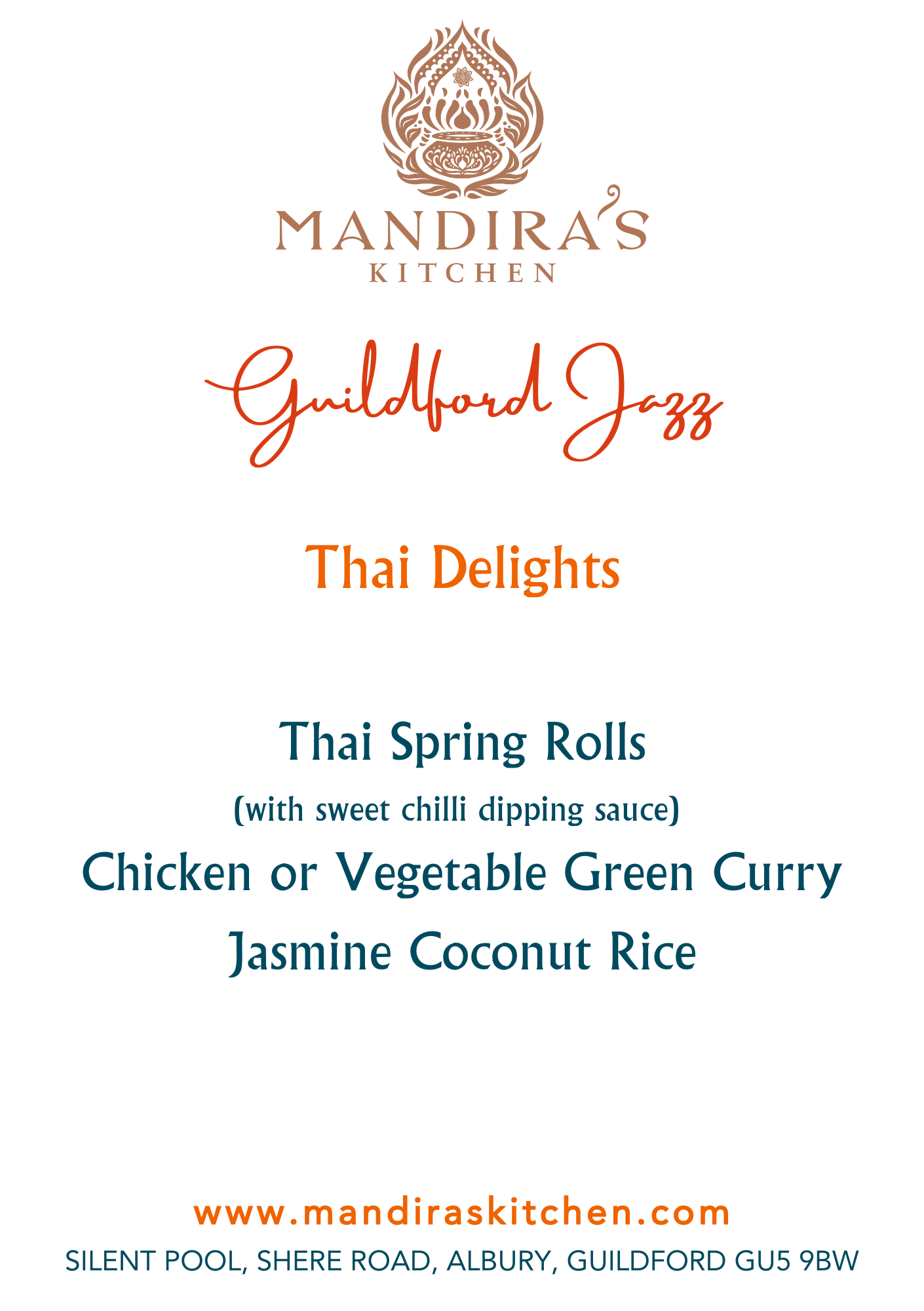 Pre-gig Thai Delights Menu from Mandira’s Kitchen! Just book your preference of chicken or vegetarian and we’ll confirm with your ticket booking