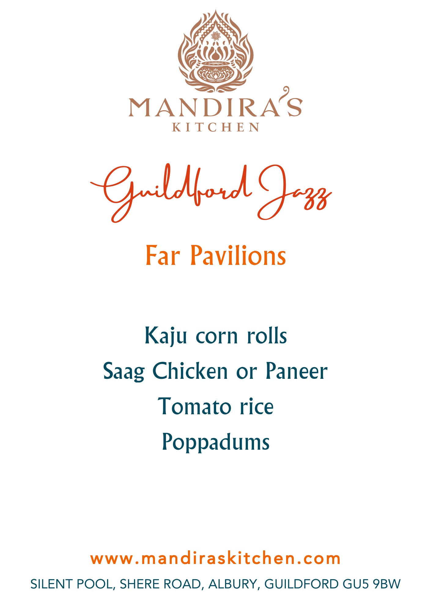 Pre-gig Far Pavilions Menu from Mandira’s Kitchen! Just book your preference of chicken or vegetarian and we’ll confirm with your ticket booking